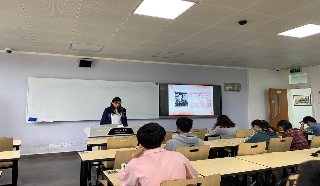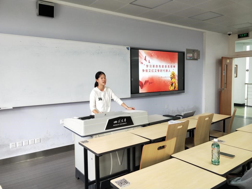 活动伊始,二班的团支部书记冯弋格同学进行发言,她强调了大学生学习革命先进事迹的意义,并向大家介绍了川大校友江竹筠的革命故事,随后王之尹、胡兆银、刘昕昊等同学分别介绍了恽代英、王右木、杨闇公的伟大事迹,先辈们坚定的革命信念与不屈的斗争精神感动了在场的每个人,几位同学慷慨激昂的讲述也让大家眼里泛起泪花。