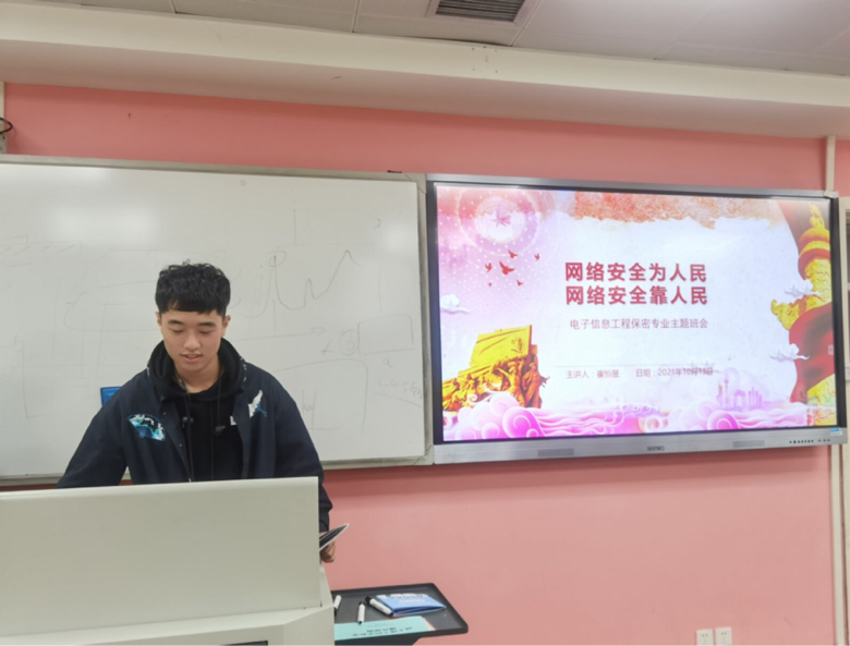 2021年10月13日下午六时,在基础教学楼A414,电子信息工程2019级二班召开网络安全主题班会,全班同学到齐。本次班会旨在深入贯彻落实习近平总书记关于网络强国的重要思想,引领青年大学生要牢固树立“没有网络安全就没有国家安全”的意识,自觉维护网络安全,努力成为网络安全的参与者、守护者、贡献者。