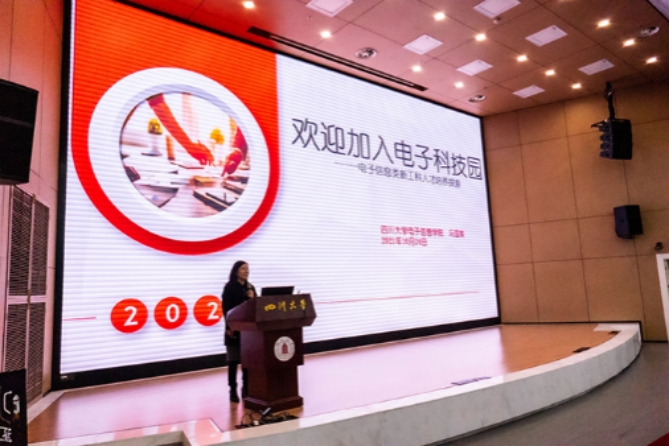 上午9:00,电子科技园会员大会暨学术交流会准时开始。第一位发言的是冯国英院长。她首先对同学们加入电子科技园表示了热烈的欢迎,接着介绍了电子信息学院的发展历程和学科培养情况,指出电子科技园在丰富学生技能、解决复杂工程方面的重要作用,并介绍了多学科交叉融合的创新之道以及电子信息学院新工科实验平台。