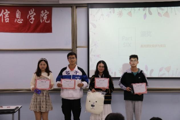 经过两个小时的激烈角逐,王文凯同学最终凭借幽默的风格与优异的语言表达能力斩获头名。本次赛事既为同学们锻炼口才、展示自我的提供了机会,也为校院大型活动遴选出了优秀的主持人。活动最后,评委为得奖同学颁发奖状与奖品。至此,2021年电子信息学院“青春飞扬,声动校园”主持人大赛圆满落幕。