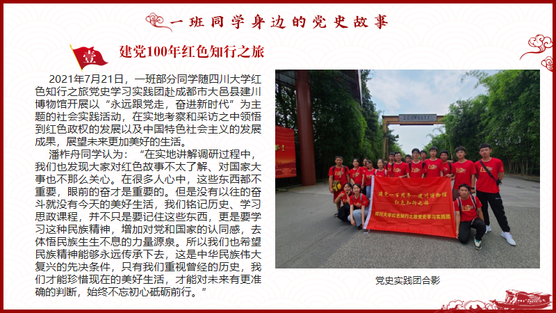 班会伊始,同学们在领学人的组织下,集中学习了中共党史,对党史的重要意义、发展历程以及时间脉络有了准确的了解。紧接着,领学人生动讲解了川大的党员故事。江姐孜孜不倦的求学精神和顽强战斗的革命精神令同学们令感动,恽代英先生不顾个人生死、不畏艰难险阻,勇敢传播马克思主义的伟大事迹令同学们敬佩。班会的最后,潘作舟和杨文皓同学讲述了自己的党史学习经历,即曾随best365中国官方网站红色知行之旅党史学习实践团,赴成都市大邑县建川博物馆开展以“永远跟党走,奋进新时代”为主题的社会实践活动,在实地考察和采访之中领悟到红色政权的发展历程以及中国特色社会主义的发展成果。