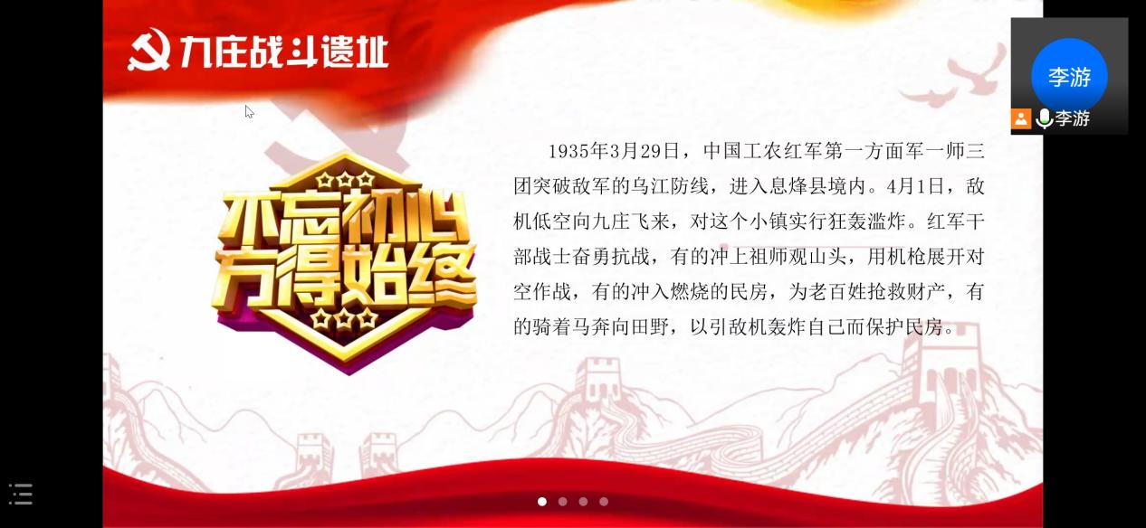 本次学习活动以“讲述身边的党史故事”为主题,并以此为基础,深刻发掘其内涵,创新转化其理解。本次活动由李游同学主持,介绍了九庄战斗遗址以及夏侯苏民烈士的故事。此次活动前期准备充分,形式新颖,各班委同学分工明确。