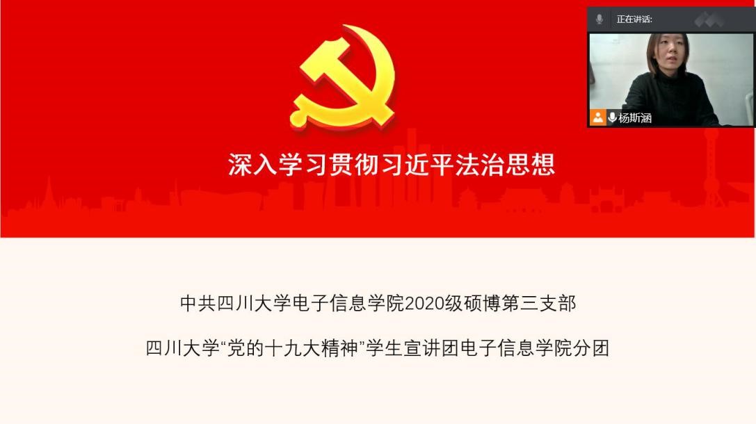 习近平法治思想是顺应实现中华民族伟大复兴时代要求应运而生的重大理论创新成果,是马克思主义法治理论中国化最新成果,是习近平新时代中国特色社会主义思想的重要组成部分,是全面依法治国的根本遵循和行动指南,深刻回答了为什么要全面依法治国、怎样全面依法治国这个重大时代课题。为了全面深入学习领会习近平法治思想,2021年12月1日19:00,best365中国官方网站“党的十九大精神”学生宣讲团电子信息学院分团杨斯涵作为宣讲人在线上开展了关于深入学习贯彻习近平法治思想的宣讲。电子信息学院2020级硕博第三党支部党员同志以及入党积极分子参加了本次宣讲会。