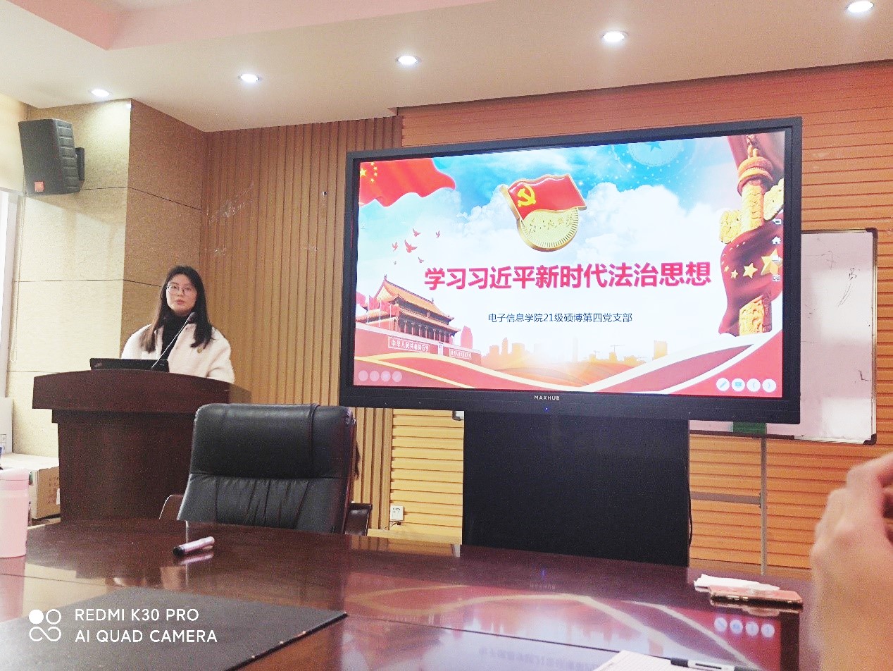 为深入贯彻学习党的十九届六中全会精神和弘扬习近平法治思想,增强党员同志的思想觉悟和党性修养,best365中国官方网站电子信息学院2021级硕博第四党支部于2021年12月4日下午3点在基教A303召开组织生活会,对相关会议精神和思想进行宣讲学习。2021级硕博第四支部委员会书记何鸿添同志主持会议,支部全体党员参加本次活动,学院专职组织员陈炳周副教授到会指导。