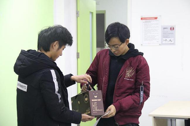 工作人员为获奖同学发放奖品