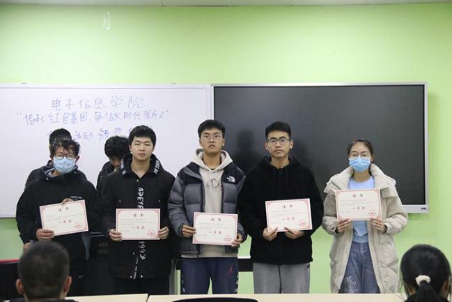 经过学院内为期一周的评奖及汇总,共评选出一等奖2位,二等奖4位,三等奖6位,优胜奖12位。颁奖活动准时展开,主持人由优胜奖、三等奖、二等奖、一等奖的顺序宣读获奖人员名单。其中,荣获一等奖的两篇征文作品《传承红色家风蕴含初学使命》和《从党史看建党精神》,将代表电子信息学院参加校级评选。随后获奖同学在工作人员的组织下依次领取奖状、奖品并合影留念。
