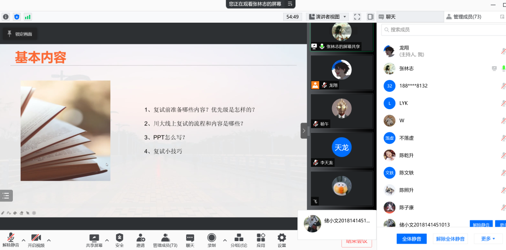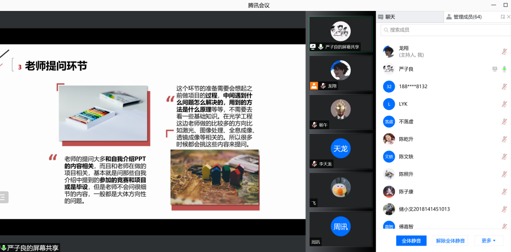 考研初试成绩出来后,不同情况的考生需要根据自己的分数情况尽快安排相关的事宜,为了让同学们能够有更多充足、有效的准备,电子信息学院本科2018级于3月3日14:30举办了线上“考研复试经验交流会”。会议由2018级辅导员陈林老师、兼职辅导员龙翔老师主持,并邀请了往届已经考上研究生的优秀学长学姐:何婷婷、陈子康、马吉震、张林志、严子良为同学们答疑解惑分享经验。