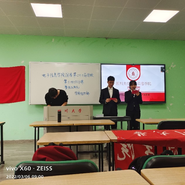 2022年3月6日9点至11点半,电子信息学院团学组织部于江安校区综合楼B座207教室举办了电子信息学院第二十三届团校最后一次行课。本次活动旨在让同学们深入了解党史,同时也使同学们了解到保研相关事宜。本次活动出席嘉宾有朱婧老师和已保研至浙江大学的蔡泽斌同学,学院大一大二学生积极参与活动。