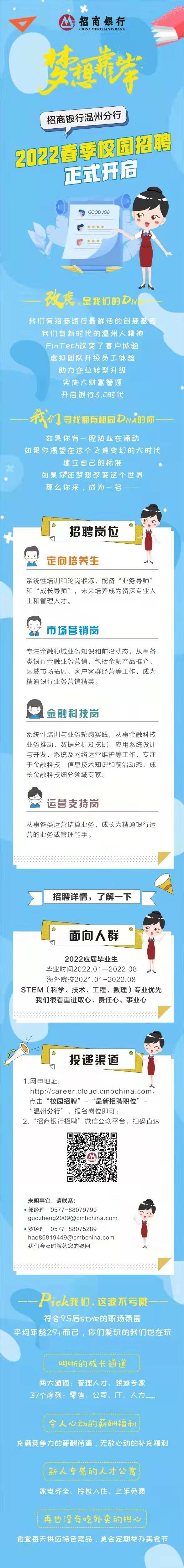 招商银行温州分行2022春季校园招聘啦招商银行是全球500强企业上市公司,市值破万亿。温州分行校招优政:三年员工宿舍(拎包入住公寓);所有岗位年薪10万起;3个月入职培训(含招银大学)+上岗双导师辅导;文体活动丰富,各类俱乐部; 每月读书心得100元,跑步100元,总行中稿1000元......。 欢迎看图扫码网申,线上面试已启动
