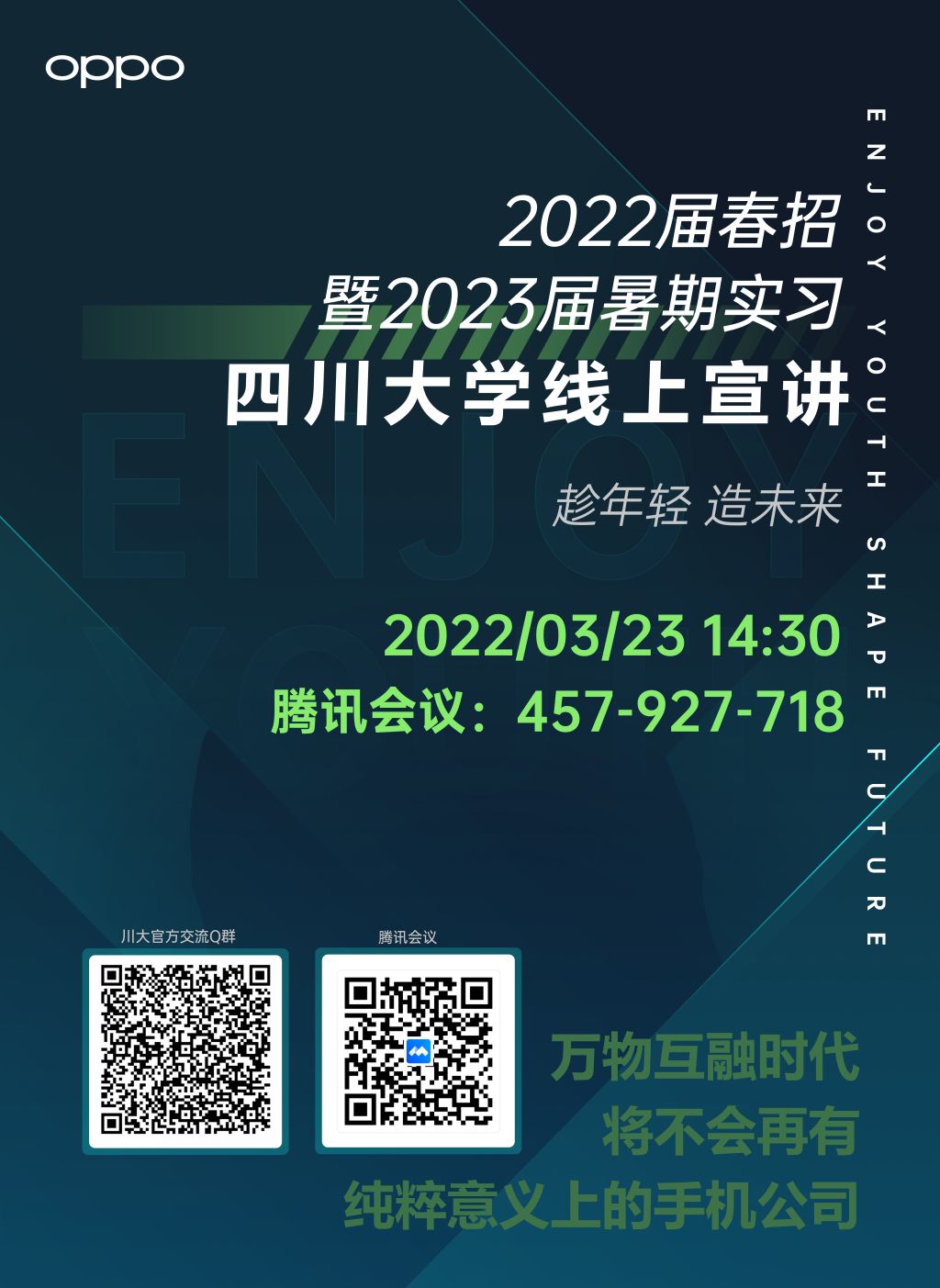 OPPO 2022春招&23暑期实习线上宣讲-川大专场宣讲时间:3月23日(周三)14:30宣讲平台:腾讯会议:457-927-718宣讲彩蛋/福利:1. 参与宣讲,有机会抽取OPPO手机和周边哦!2. 热招岗位和部分成都岗位揭秘,还有技术负责人HR1对1答疑!3.提前独家获取OPPO下一步笔试面试计划、校招具体行程!