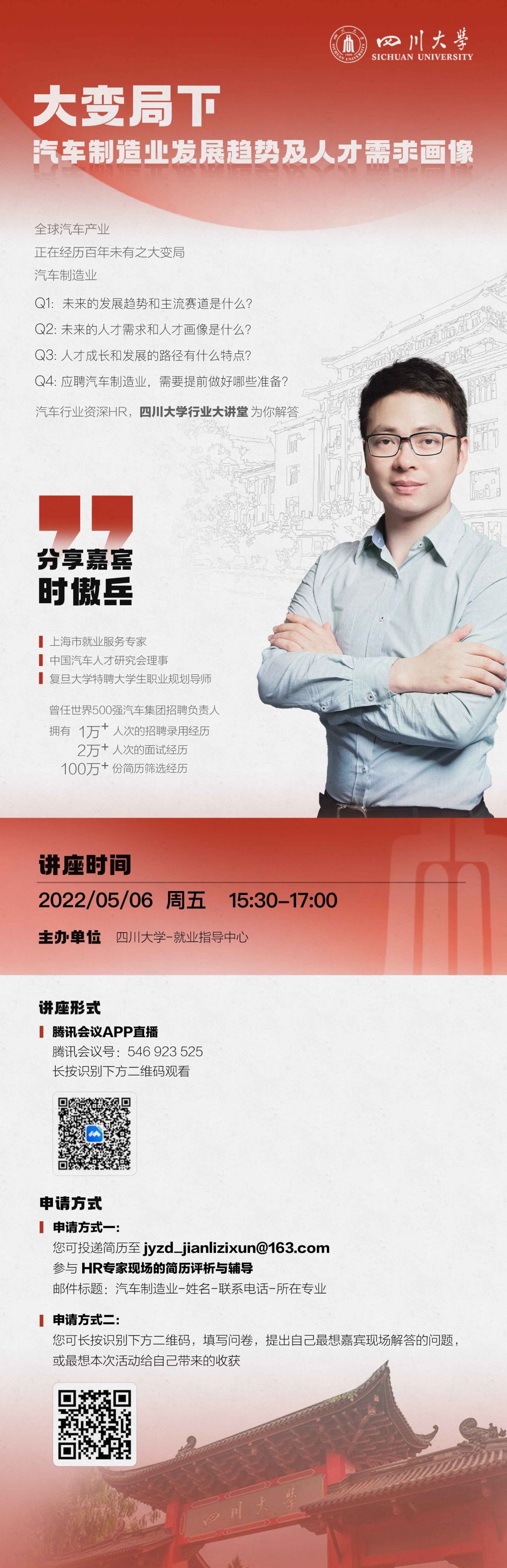 5月6日(周五)我们将开展best365中国官方网站行业大讲堂之汽车制造业发展趋势及人才需求画像,特别邀请了汽车行业资深HR、中国汽车人才研究会理事时傲兵为大家进行线上分享,请对同学们进行广泛宣传,大家积极参加了解。