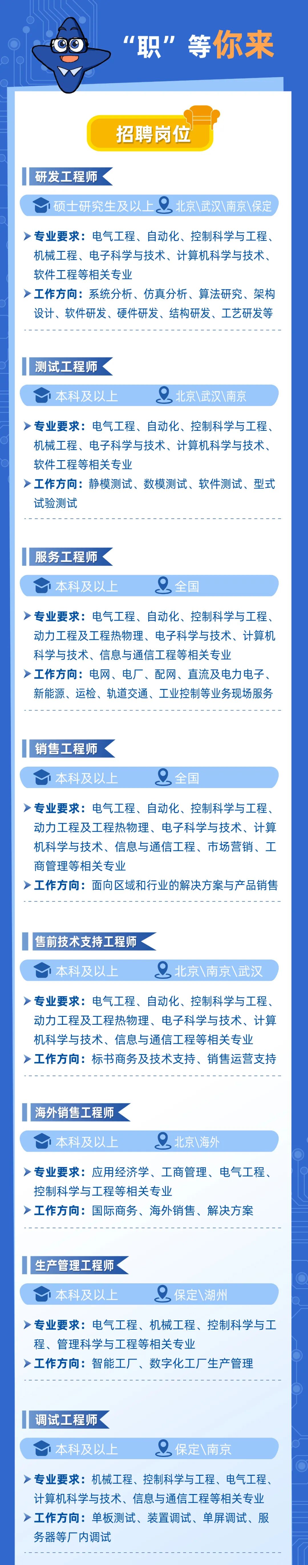 工作地点可选武汉、南京、保定、湖州、北京,工程岗位工作地点全国可选!