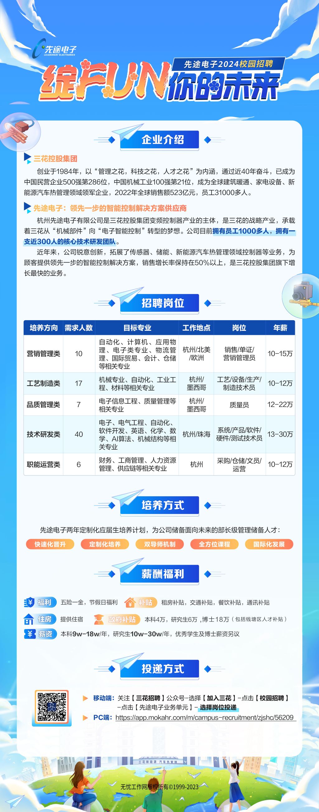 三花控股集团-杭州先途电子有限公司2024秋招宣讲会-成都站正式启动 研发副总亲临现场 可指导就业方向best365中国官方网站(望江校区)宣讲时间:10月13日下午15点20分宣讲地点:就业指导中心305室到场惊喜:面试直通卡抽选、优先面试圈、精美伴手礼~共计100+offer,五大岗位类型,研发类13-30w,营销类10-15w,品质管理类12-22w,工艺制造类10-22w,职能运营类10-12w【关于公司】 三花控股集团创业于1984年,中国民营企业500强第215位,中国机械工业100强第21位,全球建筑暖通、家电设备、新能源汽车热管理领域领军企业,2022年全球销售额523亿元,员工31000多人。杭州先途电子有限公司是三花控股集团变频控制器产业的主体,是三花的战略产业,近年来,公司锐意创新,拓展了传感器、储能、新能源汽车热管理领域控制器等业务,为顾客提供领先一步的智能控制解决方案,是三花控股集团旗下增长最快的业务。【六大体系】 研发、营销、制造、质量、供应链、职能 【面向对象】2023年9月~2024年7月,海内外高校应届生 【工作城市】杭州or珠海,杭州为主,部分岗位有海外工作机会 简历投递方式:扫描下方海报二维码进行岗位选择特别说明:考研、考公的同学可凭录取通知书免违约金 期待和你携手 迈向先途 成就未来