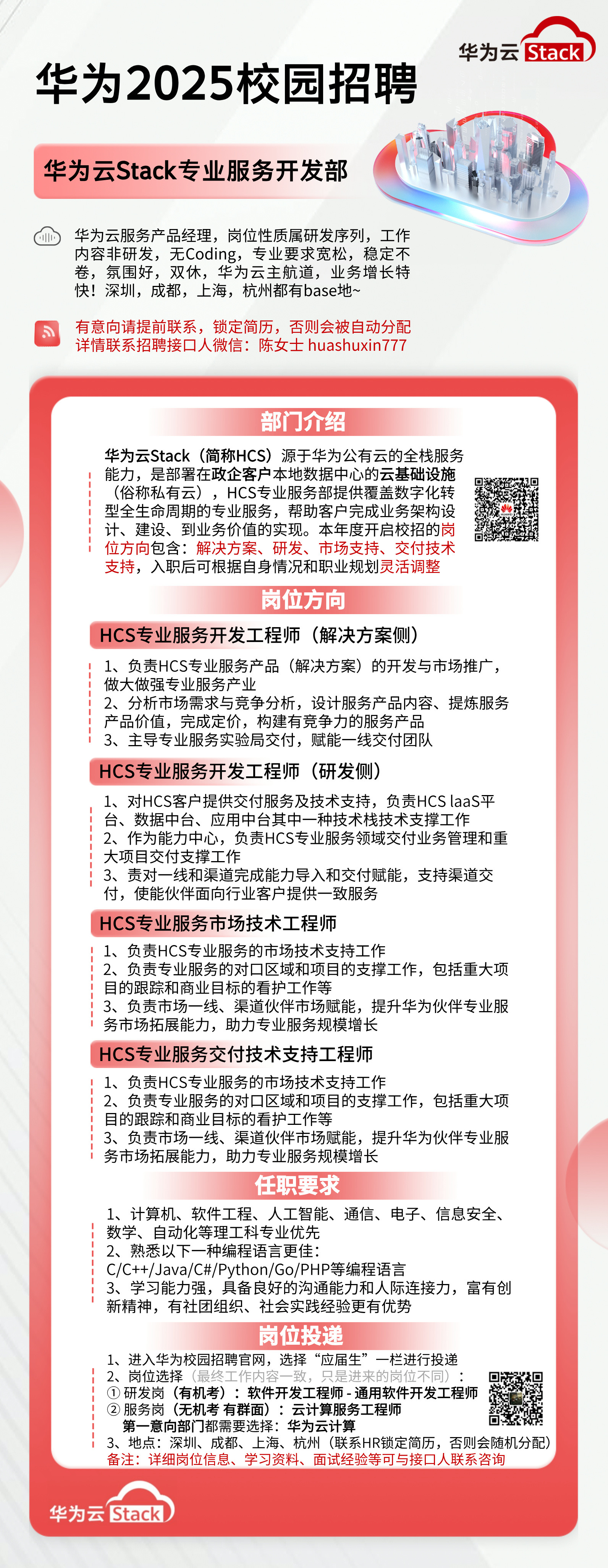 华为云部门-产品经理/解决方案向岗位,薪酬同属研发序列,专业不限制,理工科是加分项,base地有:深圳、上海、成都、西安、杭州,有意向的同学可以添加招聘接口人微信:huashuxin777 详聊~