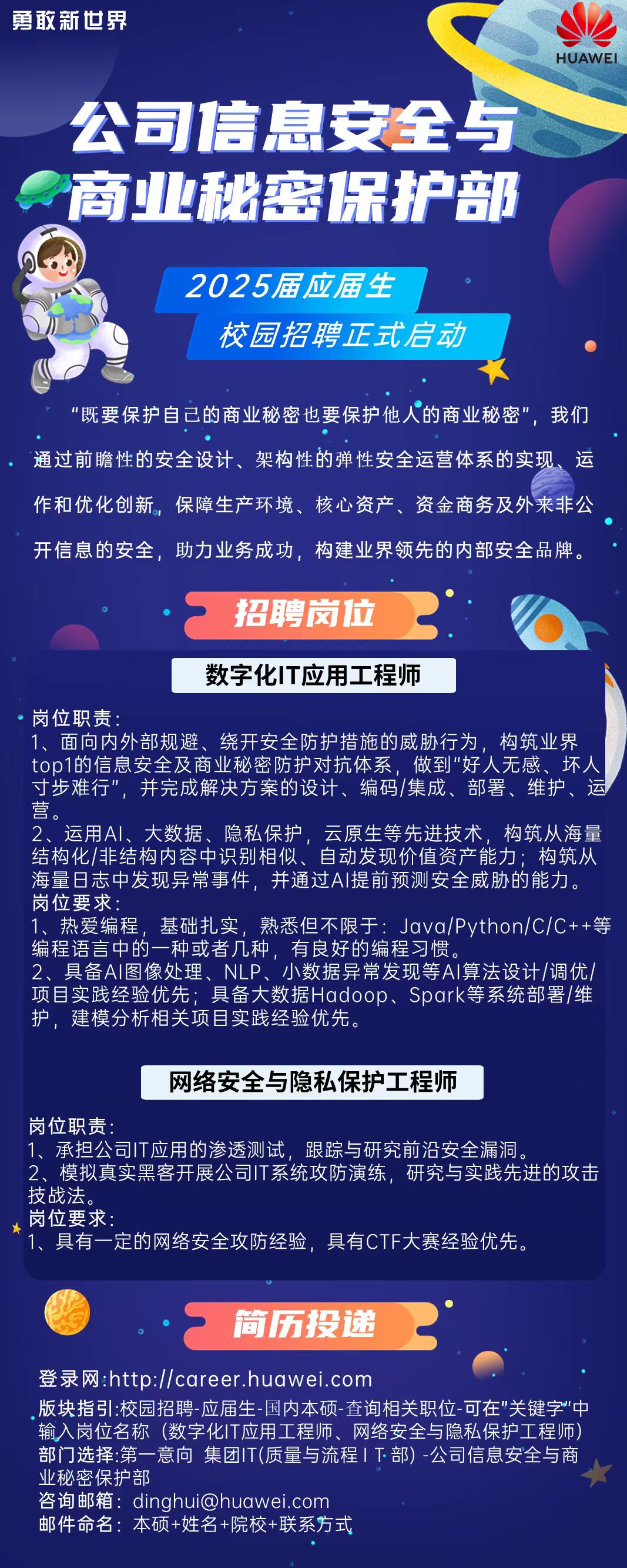 部门使命:为全公司提供领先的安全防护方案,保障全公司创新所产生的信息资产。如果你想在大数据和AI领域深入耕耘;如果你想挖掘未知漏洞;如果你想解决世界级的难题;如果你想拥有全球化的视野;如果你想来到深圳这个青春活力之城,体验华为总部基地的美妙工作环境;请来华为公司信息安全与商业秘密保护部。
