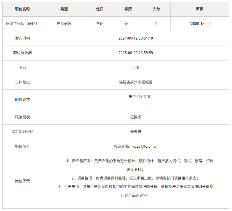 福建火炬电子科技股份有限公司校园招聘