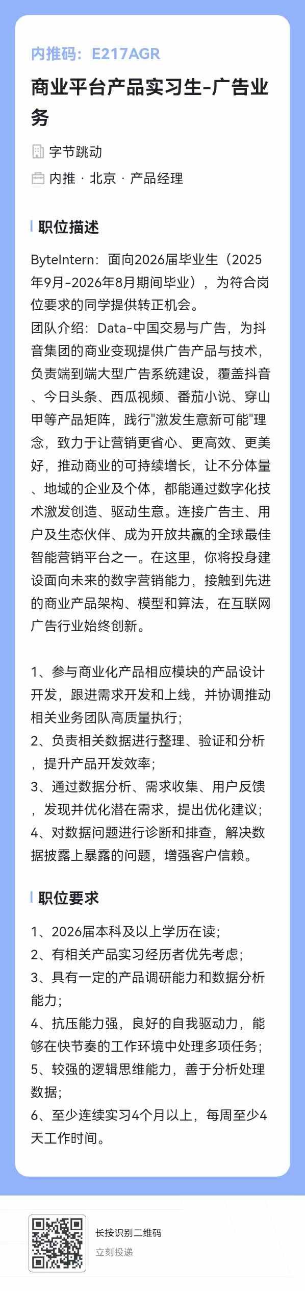 在字节的我院2018级硕士王校友(微信wy731505024)发消息,招26年毕业的校招生、实习生(可转正),以及社招商业平台产品经理,有看机会的同学或朋友欢迎推荐