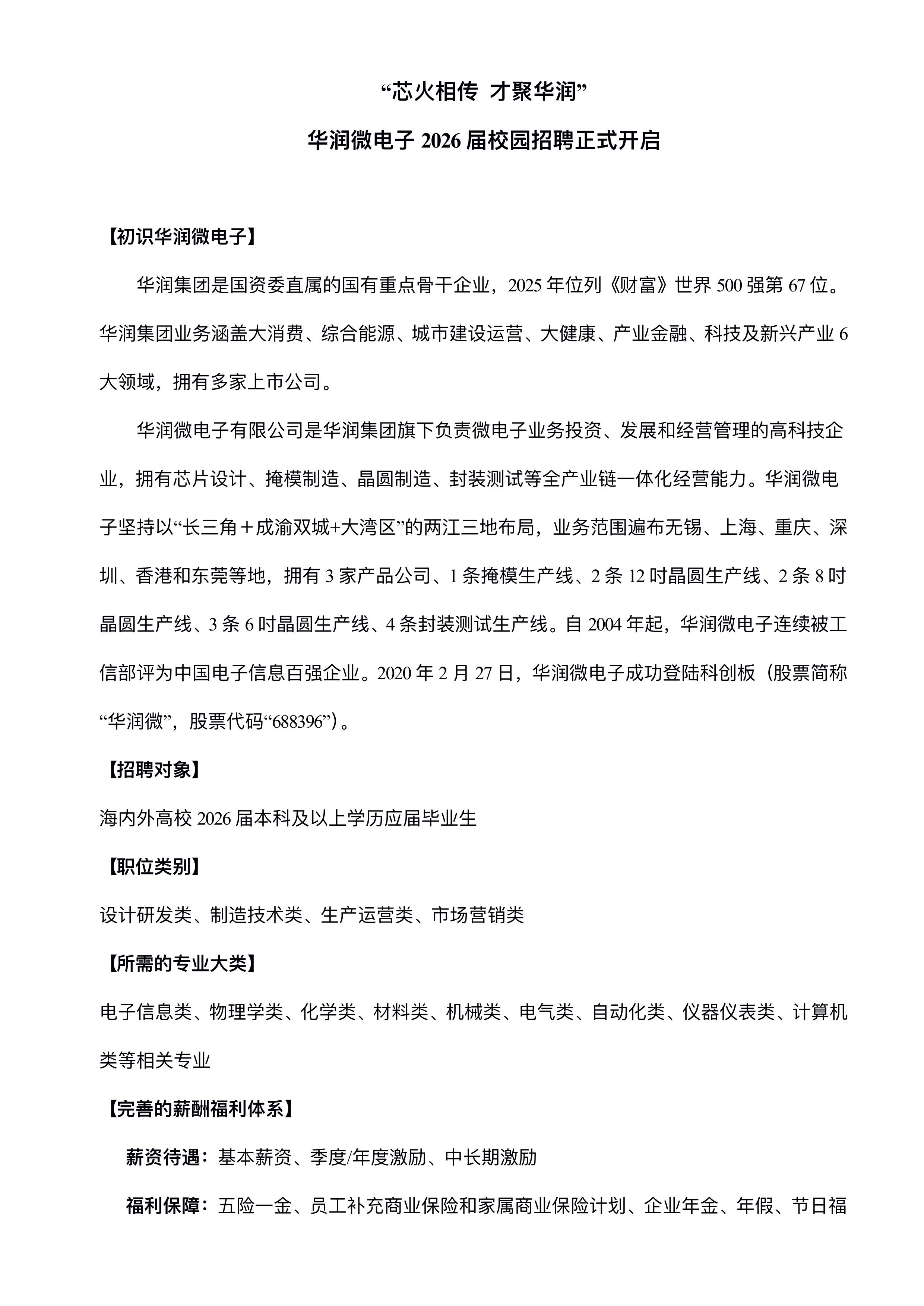 华润微电⼦ 2026 届校园招聘正