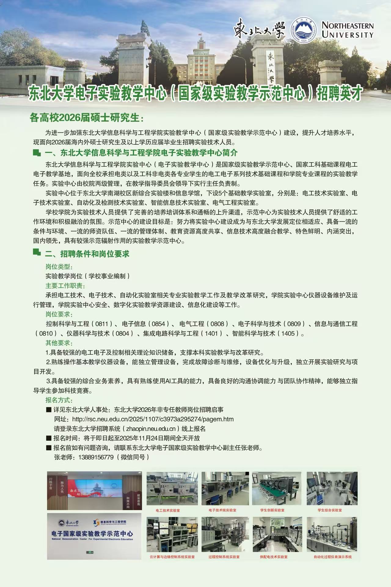 各位老师同学大家好。东北大学电子国家级实验教学示范中心面向国内外高校招聘2026届应届硕士(含博士)毕业生,实验技术岗位,