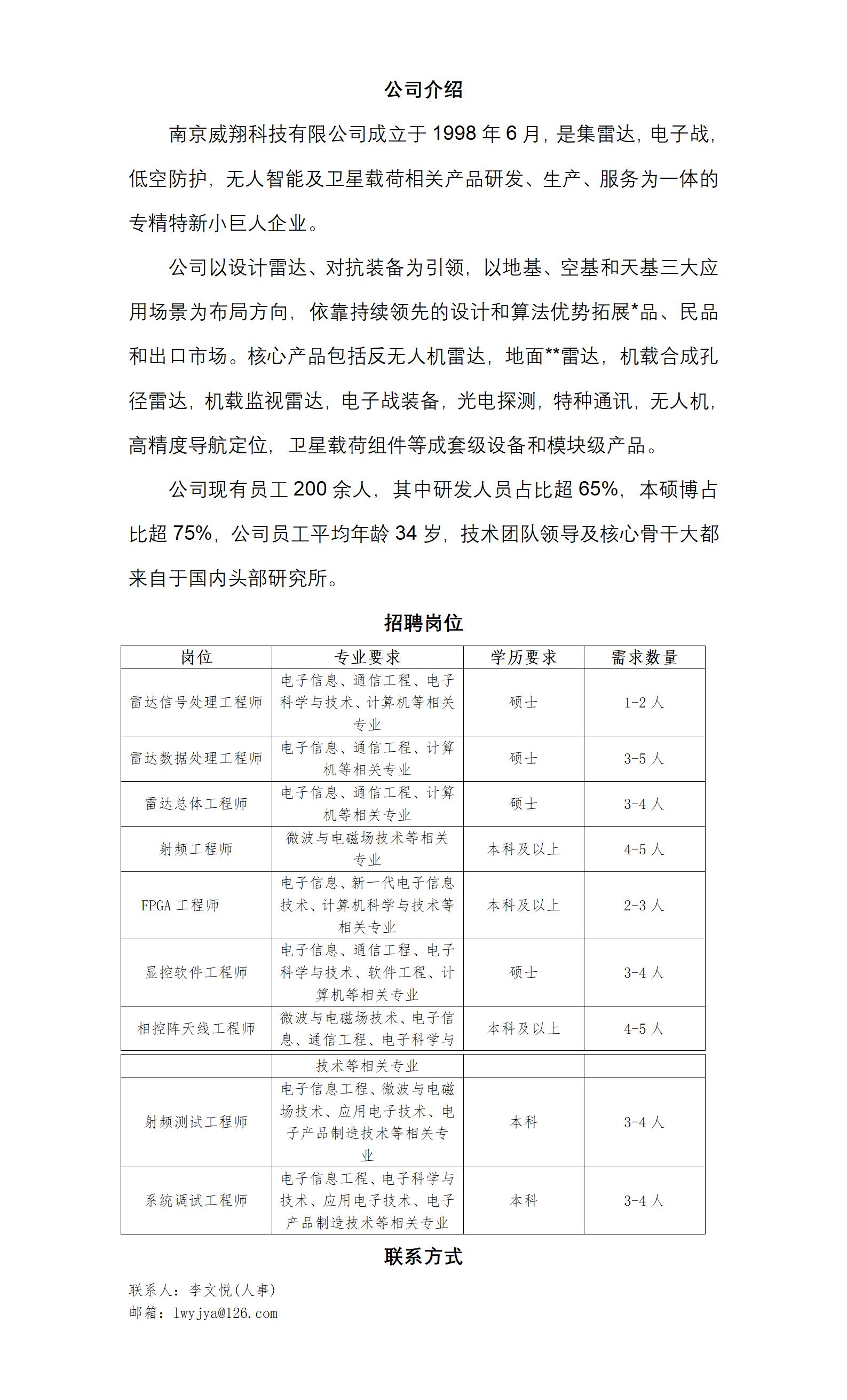 南京威翔科技有限公司春季招聘