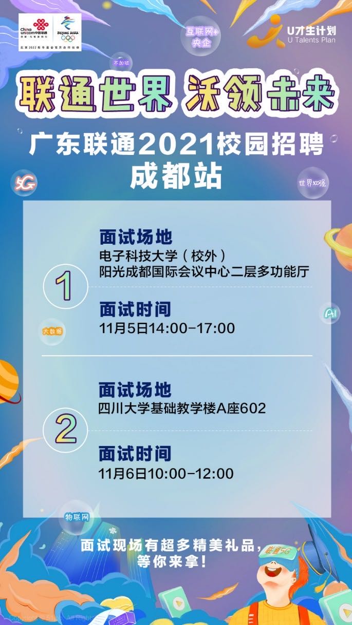 广东联通2021校园招聘正在火热进行中!【"Wo"是谁,有一说一】世界500强(排名290名)互联网+央企,活跃创新包容,我们非同一般!5G、AI、大数据、物联网、云计算,你感兴趣的领域我们都很强!首家集团层面整体推进混改的央企全国通信产业榜省级运营商联通系统第1名全集团各省分公司收入规模第1名、绩效考核第1名【生活不易,联通顺意】入职即发3千启航津贴,每年晋升、三年3级专享定制带薪培训,专属1对1导师引领报销在职研究生学费,考取资质证书全报5年免费宿舍/住房补贴,食堂三餐都搞定七险二金,意外、重疾保险可保全家法定7大假期,不提倡加班,终身话费流量免费用岗位可轮换,向上可竞聘,超多成长路径【招聘天团,面试来袭】我们将于11月6日10:00在best365中国官方网站(望江校区)基础教学楼A座602举办“现场面试双选会”,只要你敢来,我们最快2天发Offer!