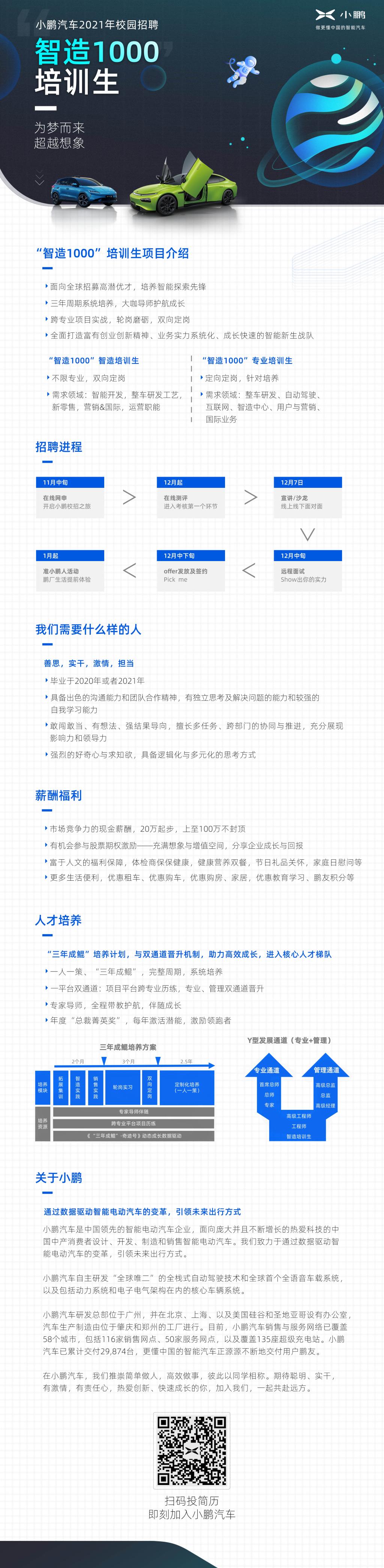 小鹏汽车招聘1000位应届生,覆盖智能研发、整车研发工艺、营销&职能,新零售等模块,不限专业,一起来塑造智能汽车无限可能性。