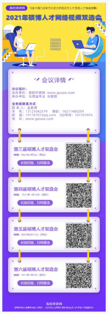 ①人才可通过添加高校师资网微信客服:16211485259、QQ群号:916033714 了解报名事项,也可以直接扫码报名(下方二维码)。(注:添加客服微信时,请注明:姓名+专业+学历+毕业院校+双选会)