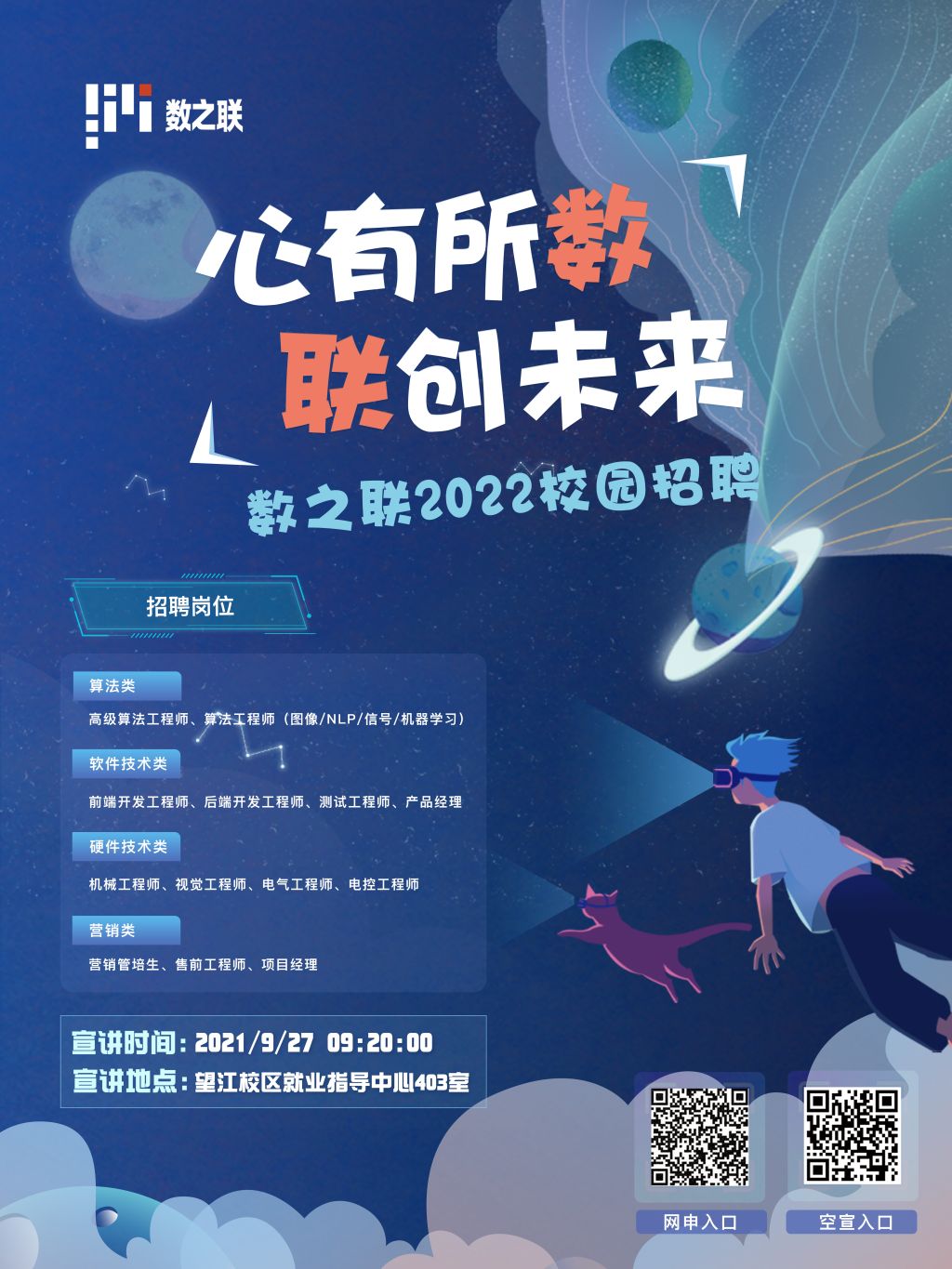 “心有所数,联创未来“,欢迎参加宣讲会~宣讲会时间:2021/9/27 09:20宣讲会地点:望江校区 就业指导中心403室招聘岗位:算法类,软件技术类,硬件类,营销类。招聘专业:计算机、软件工程、数学、电子、通信工程、材料、机械、机电一体化,自动化等相关专业。工作地点:成都。网申:http://xyz.51job.com/External/Apply.aspx?CtmID=5751788