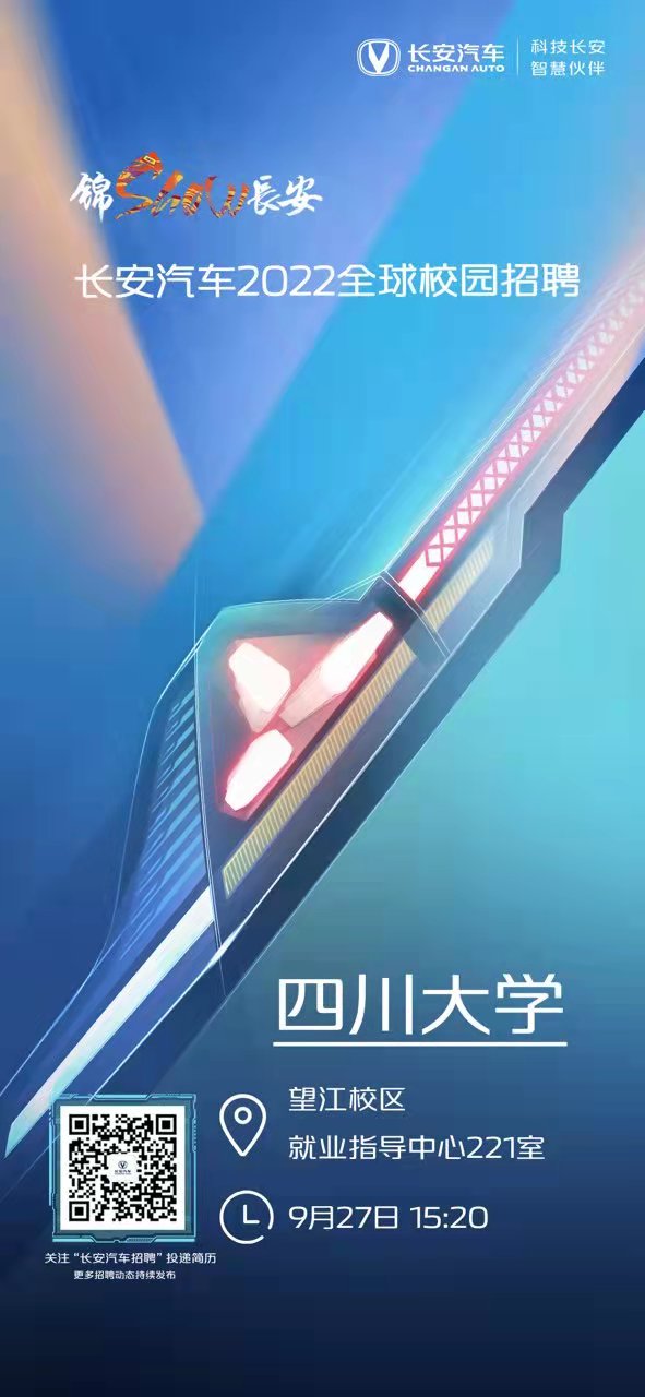 “锦Show长安——未来出行,由你定义”长安汽车2022校园招聘——best365中国官方网站站即将开启!聚川大,共同探索新知赴长安,携手创造未来长安汽车邀请您参加宣讲会,汇聚群英,共迎挑战,奔赴山海,有梦可待。大咖讲堂,智慧分享,精彩不断,为你准备了精美礼品,期待您的到来!