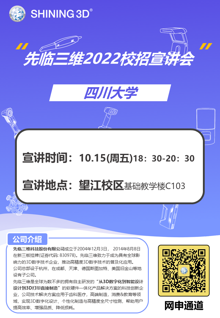 先临三维科技股份有限公司将于10月15日晚18:30将在学校望江校区基础教学楼C103举行校园专场宣讲会
