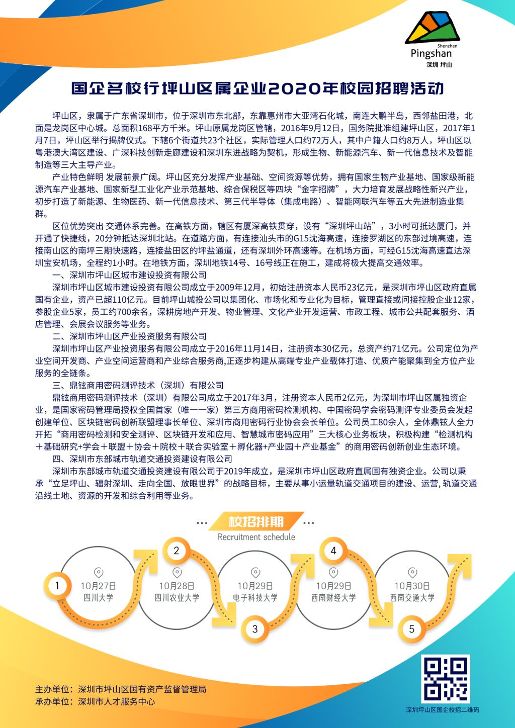 深圳市人才服务中心林胜前,已经预定下周在川大的国企招聘专场,时间是:10月27日上午9:20开始,地点是:望江校区就业指导中心3楼,和就业指导中心305、306。