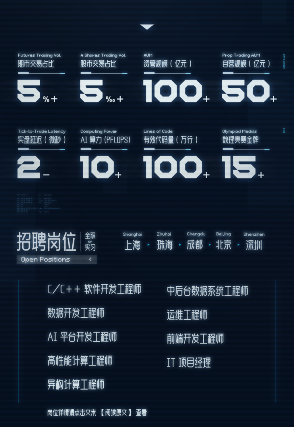 【宽德投资】信息技术部9大核心岗位火热开放! 未来量化IT大神们!想先人一步,拿到国内头部量化对冲基金公司的Offer吗?简历投起来! — 岗位涵盖—C++/大数据/AI平台/高性能计算/FPGA异构计算/数据分析/运维/前端/IT项目经理—薪资亮点 —Special Offer提前发放,至少35w起 能力过人,足够优秀,60w+—工作地点 —base成都/上海/珠海/北京/深圳 简历投递:hr@wizardquant.com全职、实习职位同步开放,点击推文了解岗位详情吧!