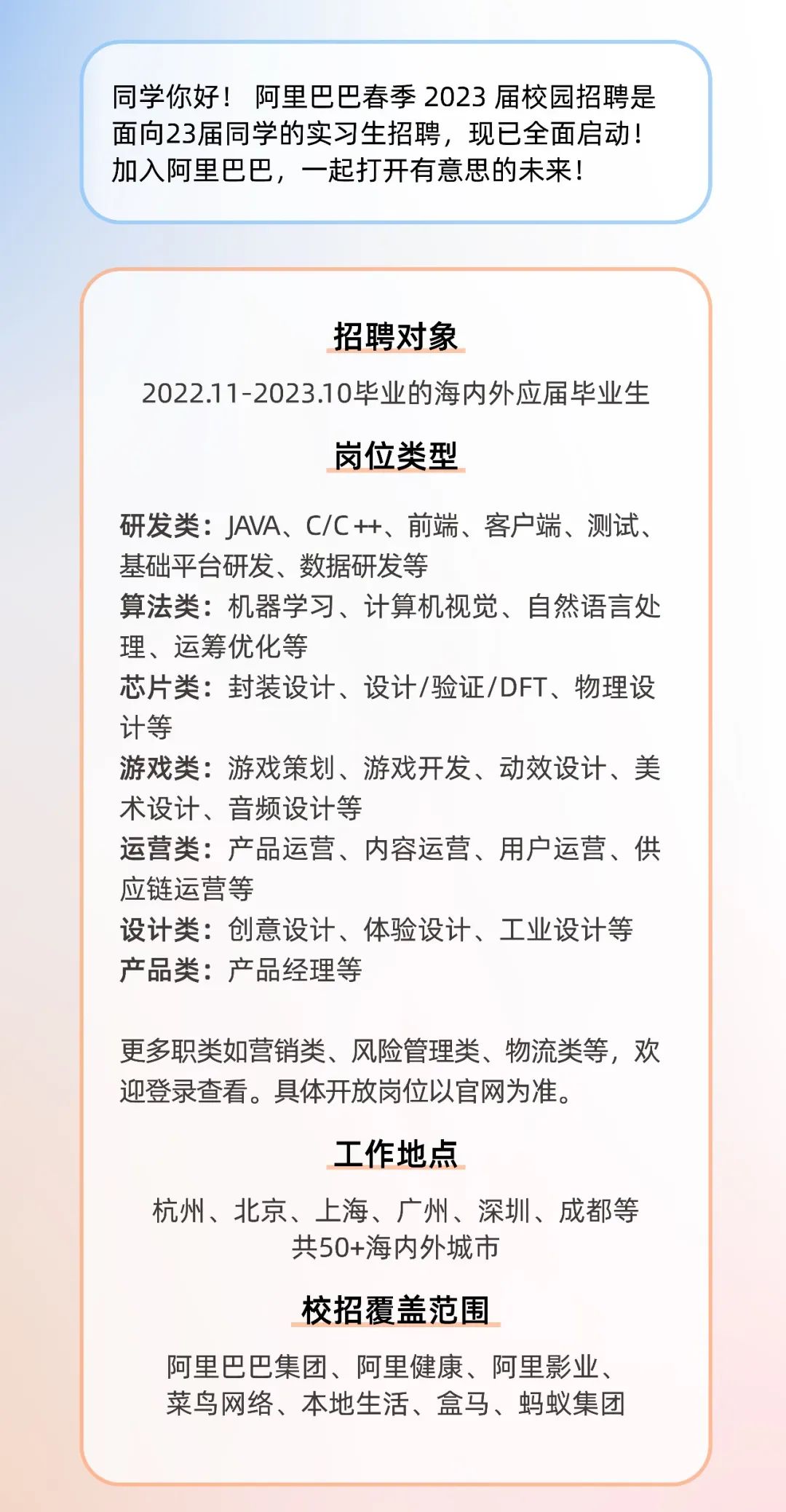 阿里巴巴春季 2023 届校园招聘正式启动!加入阿里巴巴,一起打开有意思的未来!招聘对象2022.11-2023.10毕业的海内外应届毕业生岗位类型技术类:研发类、算法类、芯片类、游戏类等非技术类:运营类、设计类、产品类、营销类、风险管理类、物流类等其他更多职位详见官网,总有一个岗位适合你!