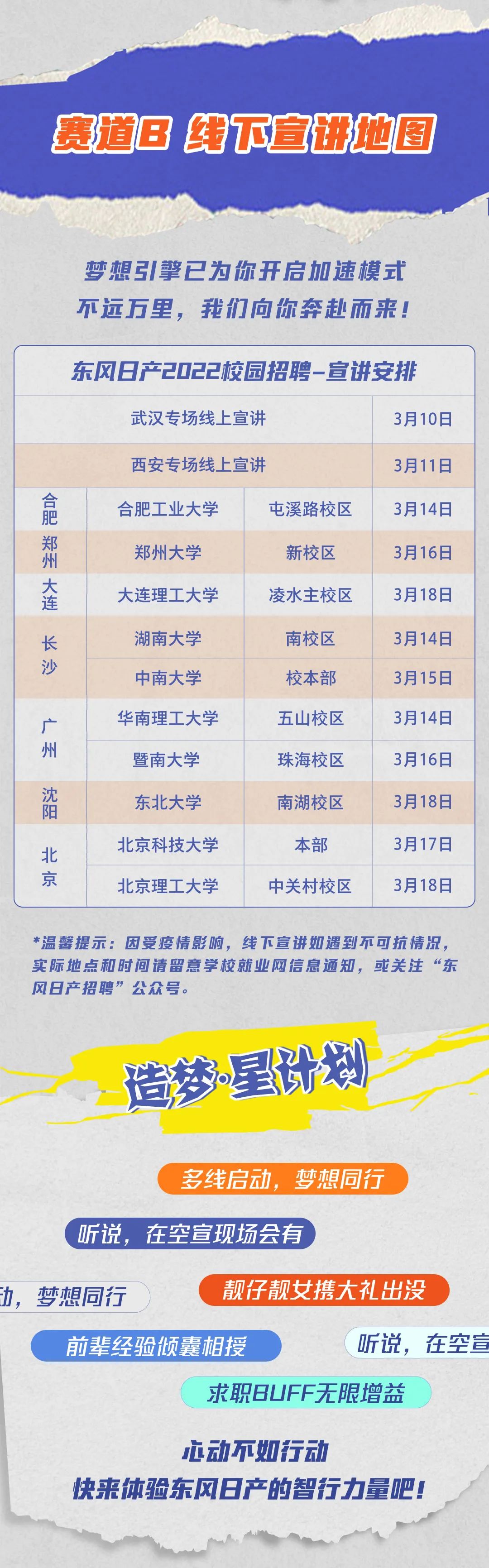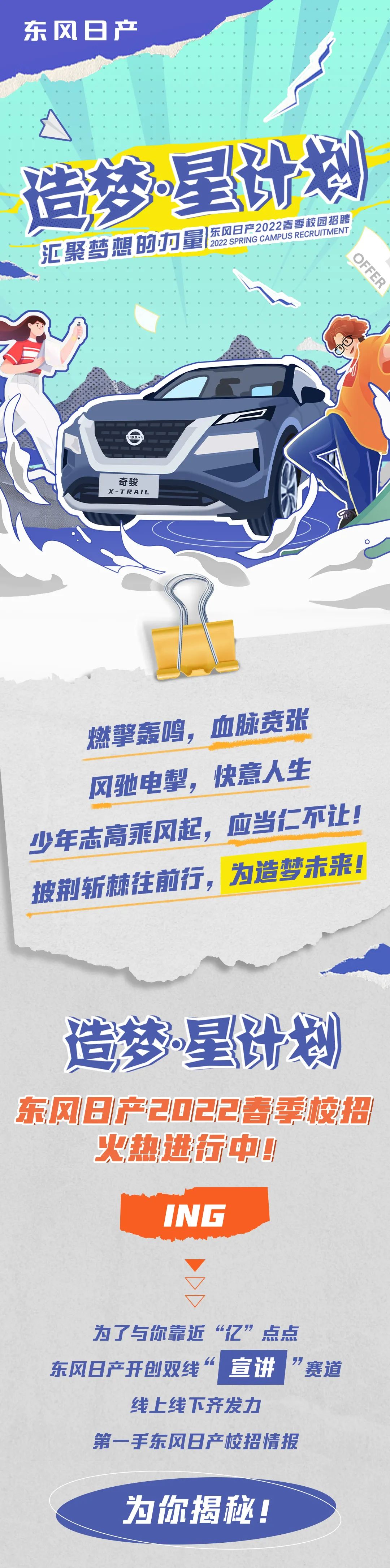 东风日产2022春招空中宣讲会将于3月9日(明天)晚上19点正式上线啦!!全面解读2022校招流程、岗位需求、应聘要求,更有丰富神秘的礼品在等你!加入东风日产,广阔天地,未来快意驰骋,即刻启程,共赴造梦之旅!请锁定空宣链接:https://xjh.zhaopin.com/show/7422我们相约周三晚上19点!欢迎网申:https://www.dongfeng-nissan.com.cn/about/recruit/campus