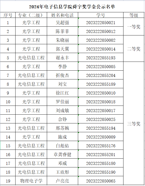 根据《关于评选2024年舜宇奖学金的通知》相关要求,通过学生自愿书面申请并提供相关材料,学院集体评审。现予以公示,名单如下。