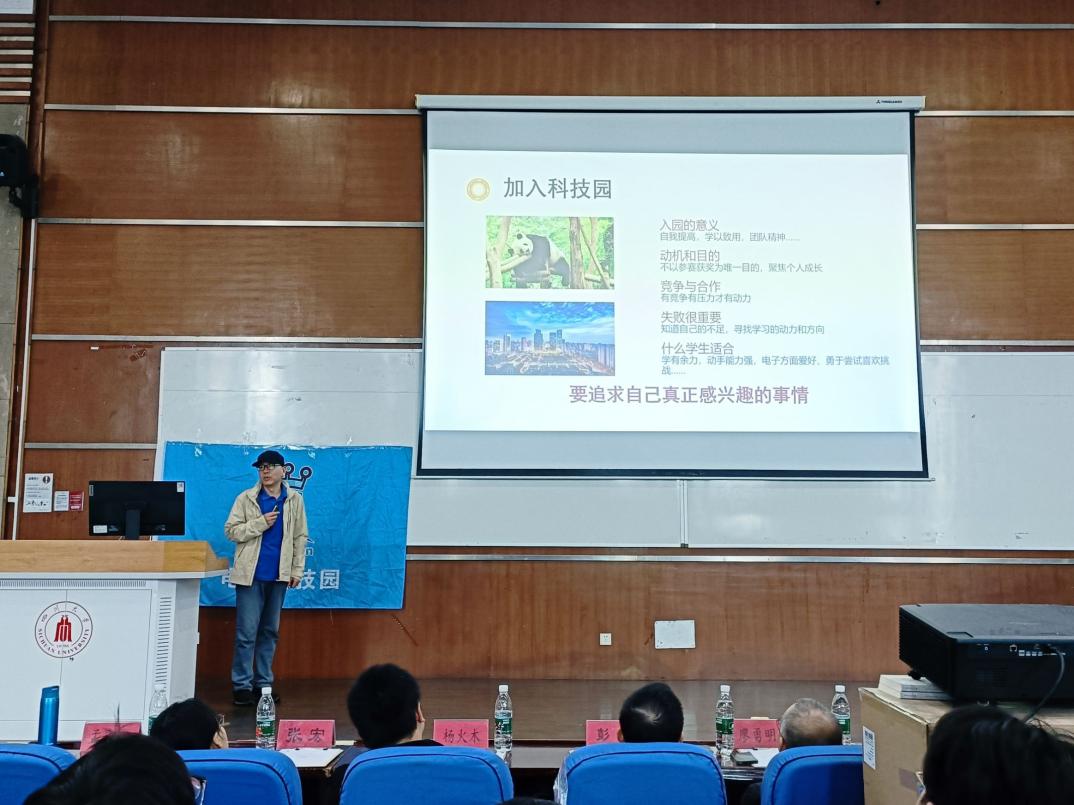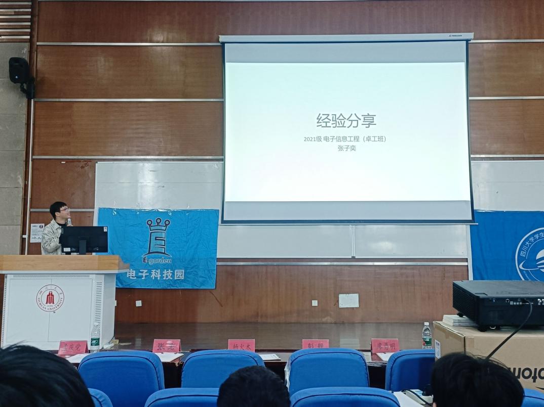 此次大会旨在为24级大一新生提供学习经验,帮助同学们安排本科学习生活计划,鼓励同学们大胆创新,勇于实践。大会开始前,各领导和老师入座,主持人宣读会场纪律。大会第一项,党委彭舰书记致开幕词,鼓励同学们大胆参加各种社团,尝试科研活动,培养自己的实践动手能力。大会第二项,学院老师分享。孟庆党老师聚焦于个人能力的发展,介绍学习经验,并侧重介绍了川大提供的学术性科研平台,深入竞赛部分,提出“以学备赛,以赛促学”的竞赛宗旨,鼓励学生有计划有目标地参加各种竞赛活动。接着吴周杰副教授分享个人科研经历,与同学们深入交流,同时讲述了光电等相关专业的科研以及工作前景。大会第三项,优秀学长交流心得体会。张子奕学长生动有趣地讲述自己的学习、竞赛、保研等经历,分享个人感悟。肖迪学长则专注于电子类竞赛的分享,详细介绍各种竞赛,并对本科四年的竞赛安排进行分析,就如何合理分配时间、提高个人综合能力提供了宝贵的建议。大会第四项,问答环节。现场的同学们踊跃提问,学长们耐心细致地解答了同学们关于学习方法、竞赛规划、科研经验等方面的疑问,不仅帮助同学们澄清了疑虑,也让他们更加明确了自己未来在大学期间的努力方向。至此,电子科技园2024会员大会暨信息科学技术分享会圆满结束。