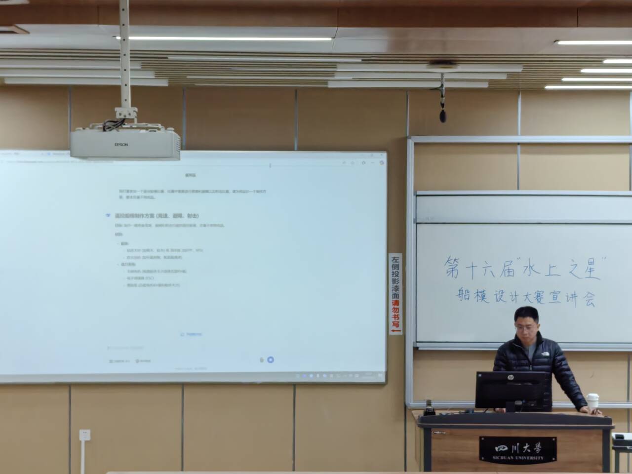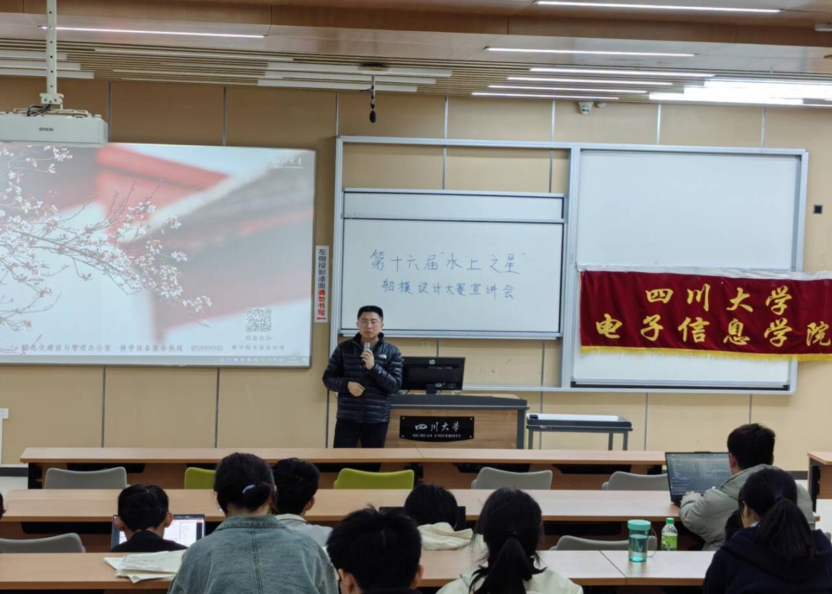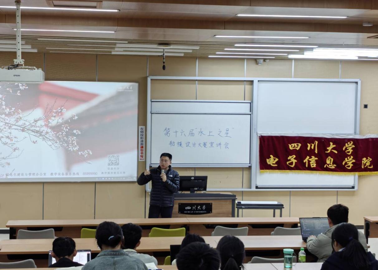2025年3月23日晚19点20分,best365中国官方网站电子信息学院在江安校区综合楼C103举办“水上之星”船模设计大赛的第二次宣讲会。本次宣讲会特别邀请了上届船模设计大赛的评委陈雨老师,为同学们解答疑问,并分享答辩的要领和技巧。