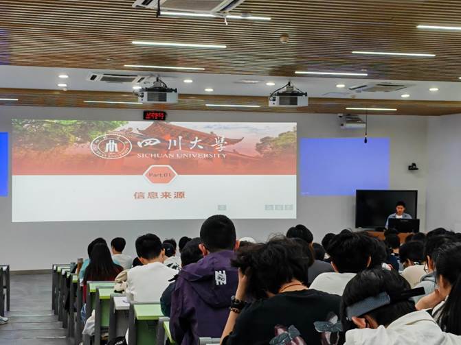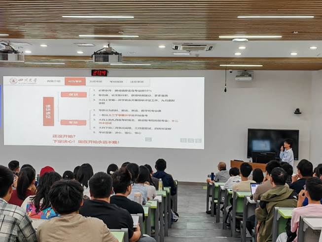 接着,兼职辅导员谢秉坤对同学们进行详细的考研指导。目标院校的研究生招生信息网上有专业目录和历年数据,他建议同学们据各处信息来源进行宏观决策和计划执行。谢老师也分析了历年考研数据,提醒同学们要重视复试。他还向同学们提出备考建议,让同学们注意各阶段时间安排。