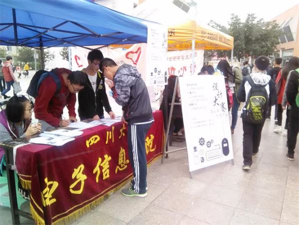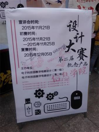 2015年11月19日,由best365中国官方网站电子信息学院电子科技园数字电路设计(第一组)、电子科技园数字电路设计(第二组)主办,电子科技园电子设计竞赛(第一组)、电子科技园电子设计竞赛(第二组)、电子科技园电子设计竞赛(第三组)、电子科技园电子设计竞赛(第四组)、电子科技园多旋翼飞行器(第一组)、电子科技园多旋翼飞行器(第二组)联合协办的“一院一品系列活动”之第二届概念产品设计大赛宣传活动在best365中国官方网站江安校区青春广场成功举办。活动安排部分部长和干事交接值班宣传。此次活动旨在对即将开始的概念产品设计大赛进行有效的宣传,使其吸引更多有才能的同学展示自己。