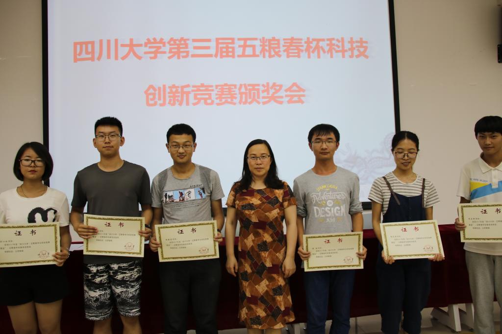 本次活动的主持人由李运国老师担任,会议开始,全体起立,高唱国歌。随后冯国英院长宣读本届“五粮春杯”获奖名单。宣读完毕之后,比赛特等奖获得者王洁同学代表全体获奖同学发言。她对自己能获得此项殊荣感到十分自豪,并对赞助“五粮春杯”科技竞赛的成都宏川酒业有限公司和学院的老师及领导表达了自己的感激之情,感谢他们提供给同学们一个可以绽放自己的平台。她还说自己会再接再励,以取得更好的成绩来回报学校学院对自己的培养之恩,并祝成都宏川酒业有限公司越办越好。王洁同学发言过后,是冯国英院长上台致辞。她首先感谢了成都宏川酒业有限公司为学院学子提供了这样一个展示自我,提升实践创新能力的平台,表扬了在此次比赛中获奖的同学,肯定了同学在比赛中做出的努力。她希望可以有更多同学能参与到“五粮春杯”等一系列的比赛中来,在比赛锻炼自己,在比赛中突破自己,成为社会中的精英人才。最后,冯国英院长为获奖同学颁奖,并和他们合影留念,best365中国官方网站第三届“五粮春杯”科技创新竞赛颁奖会圆满结束。