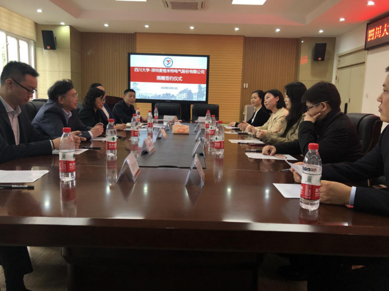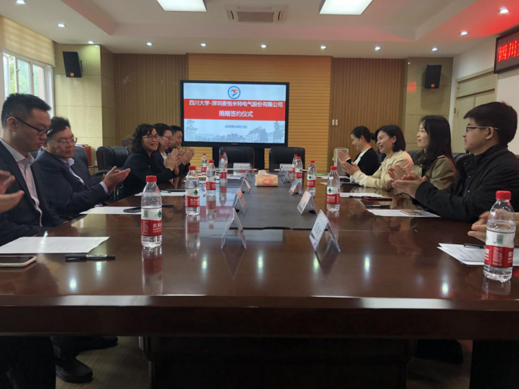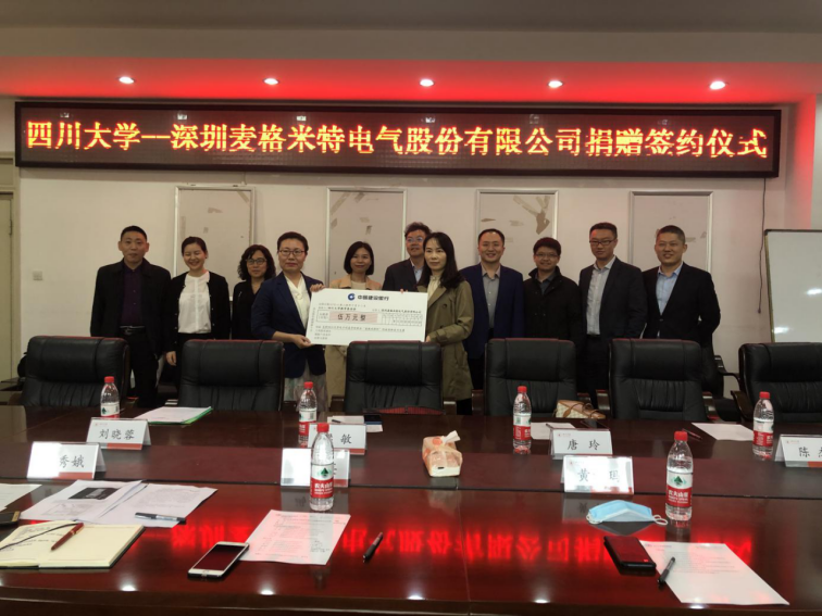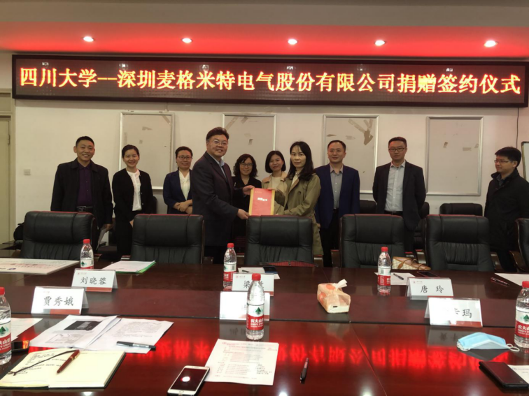 10月13日下午,“best365中国官方网站深圳麦格米特电气股份有限公司”捐赠签约仪式在best365中国官方网站望江校区基础教学楼A座303会议室举行。深圳麦格米特电气股份有限公司财务总监唐玲、行政总监梁敏、招聘经理刘晓蓉、西南地区代表匡效才、微朗科技有限公司研发总监陈杰,best365中国官方网站教育基金会副秘书长贾秀娥,best365中国官方网站电子信息学院院长冯国英、学术院长黄卡玛、党委副书记陈笃海、副院长杨阳、副院长雷印杰参加了仪式。捐赠仪式由best365中国官方网站电子信息学院党委副书记陈笃海主持。