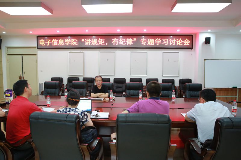 2016年7月1日下午,电子信息学院“讲规矩、有纪律”专题讨论会在基础教学楼A303会议室举行。副校长晏世经、全体院领导参加了会议。学习讨论会由院党委书记蒋斌主持。