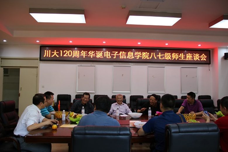 百廿川大,锦水含章,在9月28日下午3:00,电子信息学院87级毕业生们和他们的老师于基教A303会议室进行了一场师生座谈会。出席本次座谈会的有电子信息学院党委蒋斌书记、以及87级校友在校期间的老师陈祯培老师、范安辅老师、李继陶老师。