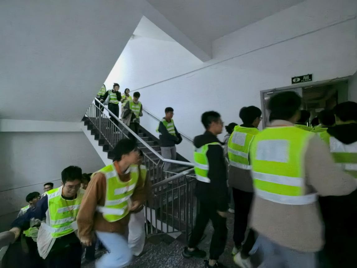 下午17时50分,随着紧急疏散信号的响起,演练正式开始。各班级在接到信号后立即停止授课,安全员迅速启动火警警铃并使用警示棒引导人员疏散。队长则负责指导学生采取正确的逃生措施,确保了疏散初期的秩序井然。