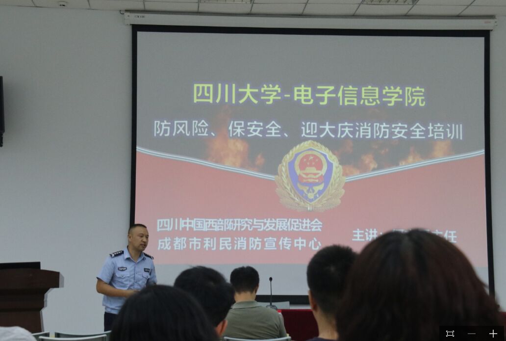 为全面贯彻落实2019年“防风险、保平安、迎大庆”安全专项活动,进一步提高全院教职员工的安全防范意识,切实增强教师安全教育的能力,2019年9月27日,best365中国官方网站电子信息学院邀请成都利民消防中心何文平教官在best365中国官方网站望江校区西五教附101报告厅召开了消防专题培训会。学院全体教职工参加了本次消防专题培训会。